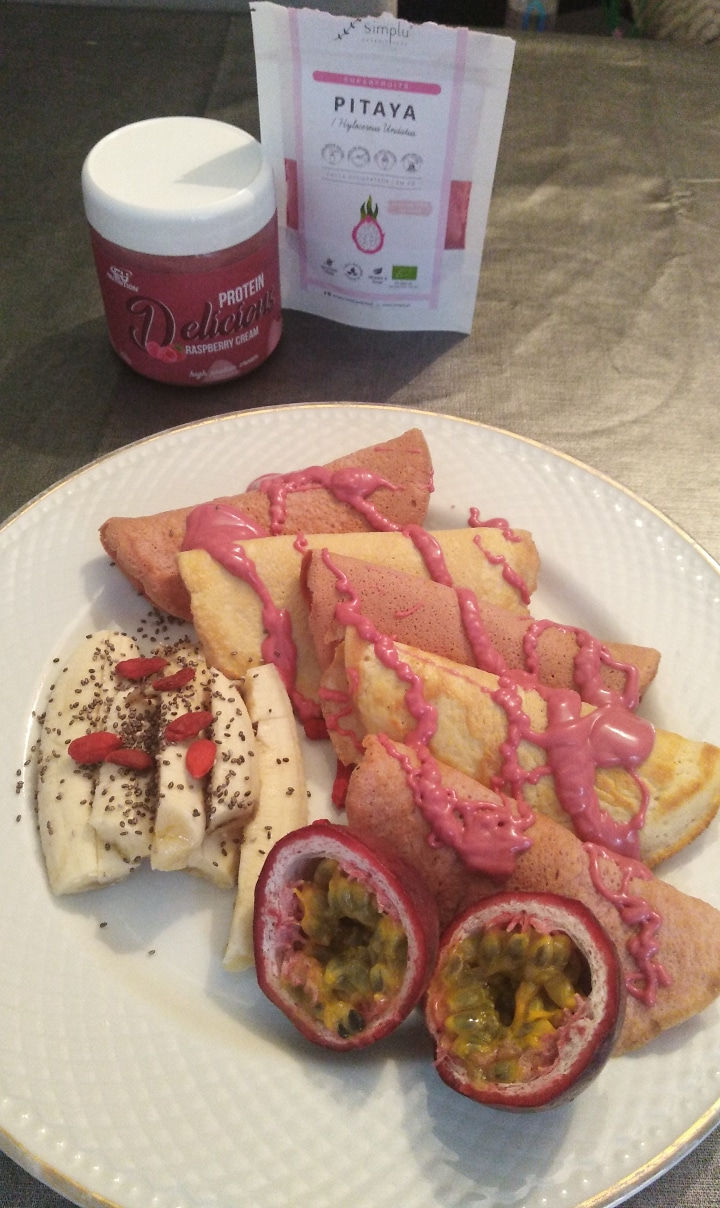 PREPARAÇÃO Aquecer uma frigideira média, untar com óleo de coco Separar metade da massa para outro recipiente e colocar o pó da Pitaya e mexer bem Despejar a massa, espalhar no fundo da frigideira em fogo baixo até doura. Virar e deixar dourar dos dois lados. Fazer assim com as 2 massas diferentes Coloquei por cima Topping de Framboesa