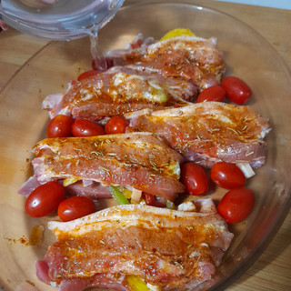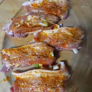 Num recipiente misturar azeite, alho, sal, piri-piri, alecrim, pimentão doce e louro